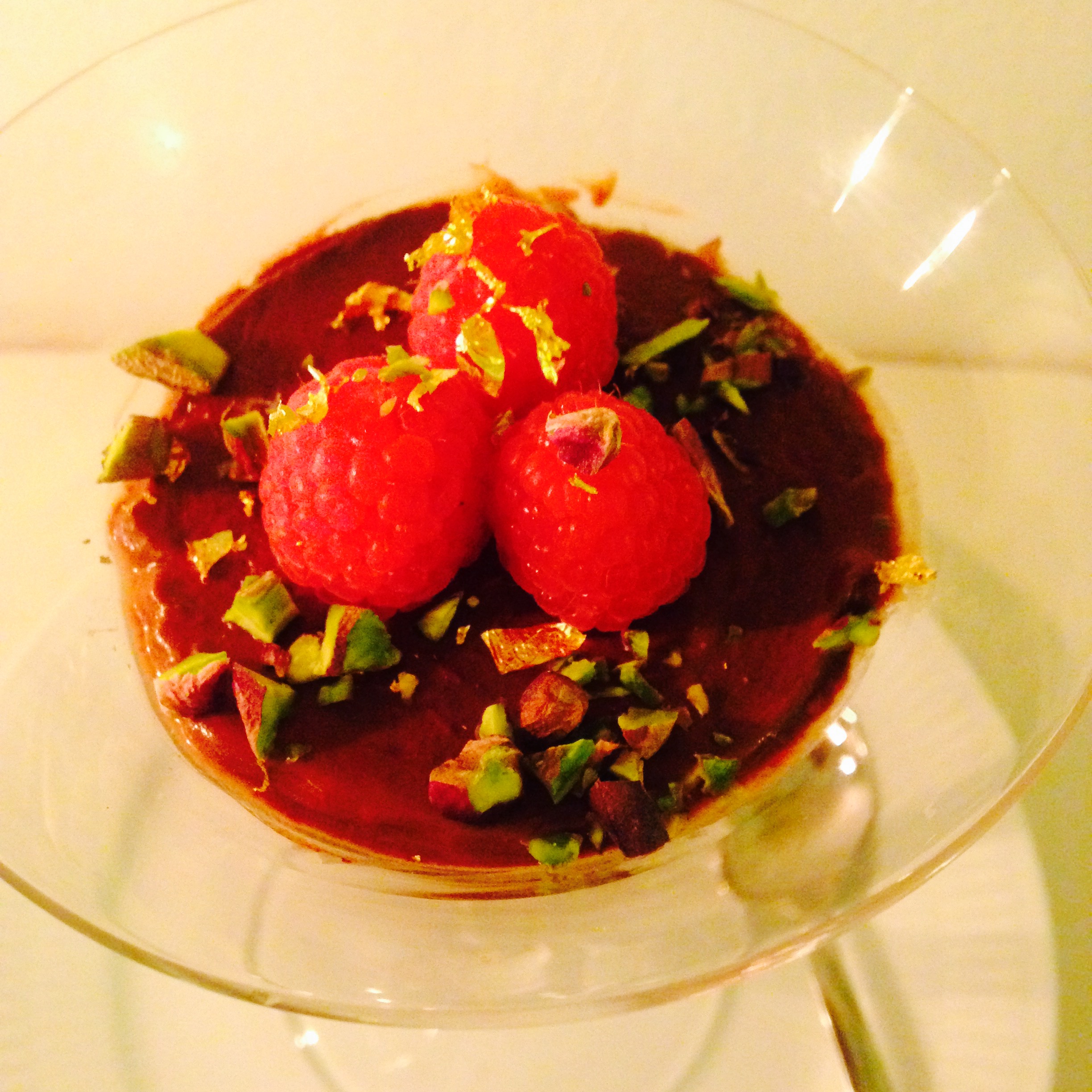 Moussen på fotoet; jeg brugte en sprøjtepose, men glattede overfladen med en teske – fugtet i Marsala. Tre hindbær blev det til, at hensyn til ‘et pænt billede’. Moussen er dog så intens, så server gerne ekstra friske hindbær ved siden af. Den er endvidere pyntet med guldblade/bladguld. Det er ægte guld 24 karat. Total ekstravagant. Det ‘feder ikke’ og skader ikke. Hvis du selv får lyst til at give dig i kast med sølv eller guld, skal du sørge for, at det er beregnet til fødevarebrug.